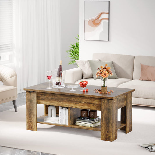Coffee Table Lift Top with Storage Compartment and Separated Open Shelves (Vintage Brown)