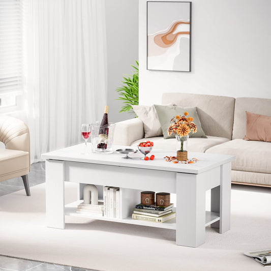 Coffee Table Lift Top with Storage Compartment and Separated Open Shelves (White)